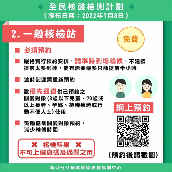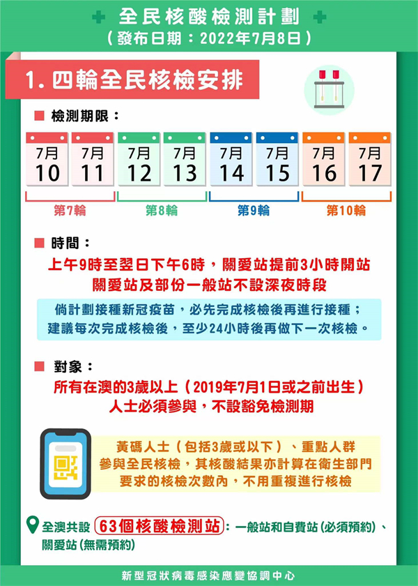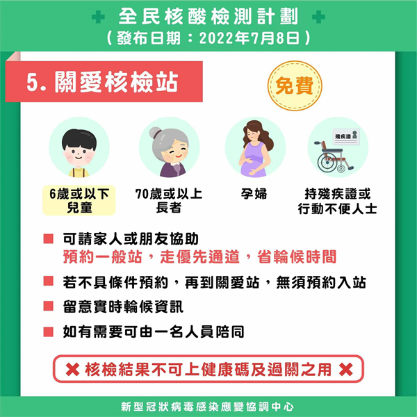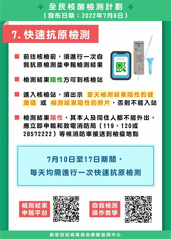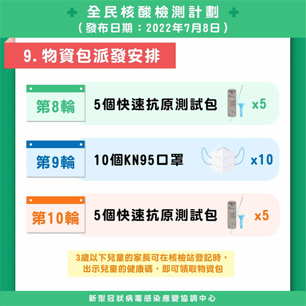 7月10日起將進行第7輪至第10輪全民核檢,0至3歲嬰幼兒可豁免核檢,而關愛站將開放予6歲以下兒童使用。7月10日至7月17日期間,每天均需進行自我快速抗原測試並申報