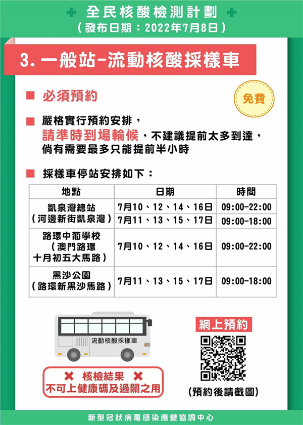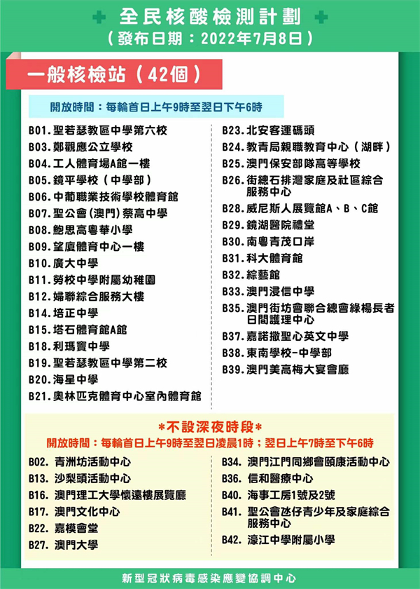 所有關愛站及11個一般站不設深夜時段,前往核酸站前,要先進行一次快速抗原檢測,出示載有快速抗原檢測結果為陰性的澳門健康碼或檢測結果陰性的照片,否則不能入站。
