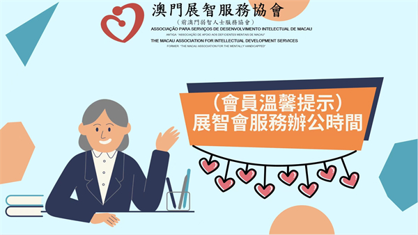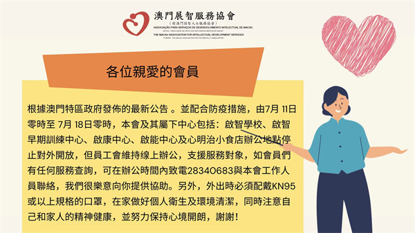 各位親愛的會員,根據澳門特區政府發佈的最新公告 。並配合防疫措施,由 7月 11日零時至 7月 18日零時,本會及其屬下中心包括:啟智學校、啟智早期訓練中心、啟康中心、啟能中心及心明治小食店辦公地點停止對外開放,但員工會維持缐上辦公,支援服務對象,如會員們有任何服務查詢,可在辦公時間內致電28340683與本會工作人員聯絡,我們很樂意向你提供協助。另外,外出時必須配戴KN95或以上規格的口罩,在家做好個人衛生級環境清潔,同時注意自己和家人的精神健康,並努力保持心境開朗,謝謝!