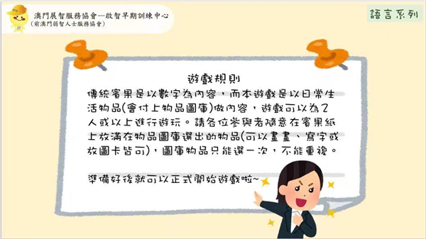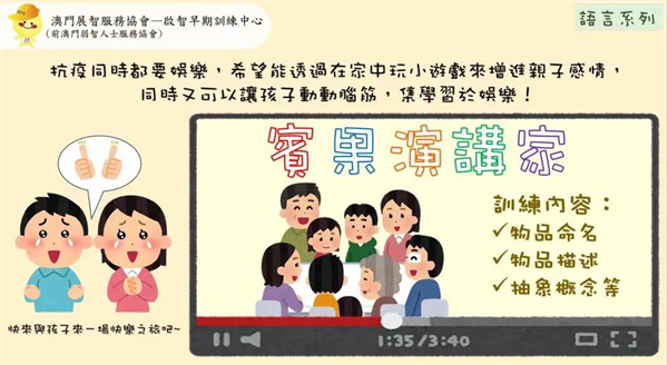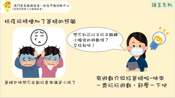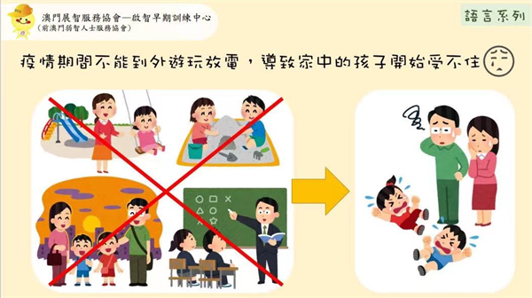 因應新型冠狀病毒肺炎疫情的發展,為減少疫情在社區傳播風險,澳門展智服務協會屬下啟智早期訓練中心暫停所有基本服務。為方便服務使用者亦能在家中做居家訓練,中心會發放關於早期治療的資訊。