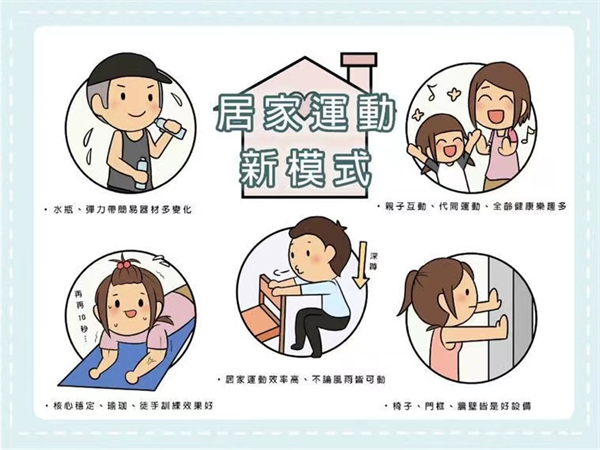 一、核心穩定、瑜珈、徒手訓練效果好:在家可以進行核心穩定、瑜珈、徒手訓練,如雙人反向跳、蹲馬步、超慢跑、太極拳、八段錦、上班族健康操、高齡者健康操等,強化平衡力、肌力、肌耐力、柔軟度或心肺耐力,促進健康。
