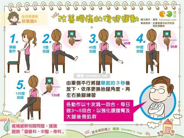 這8個動作單次各做十次為一回合,建議運用空閒時間做3至5回合,幫助強化腰、腹、臀部及大腿後側肌群,都有助改善腰腿疼痛問題。