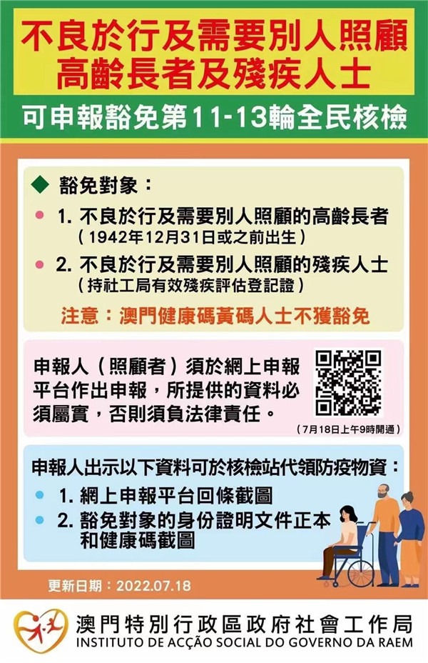 【社會工作局消息】 就有市民對全民核酸檢測豁免對象存在誤解事宜,社會工作局澄清如下:行動自如的高齡長者及殘疾人士,必須進行全民核酸檢測;不良於行及需要別人照顧的高齡長者或殘疾人士,才可申報豁免進行第11至第13輪全民核酸檢測;而澳門健康碼為黃碼人士,不獲豁免。