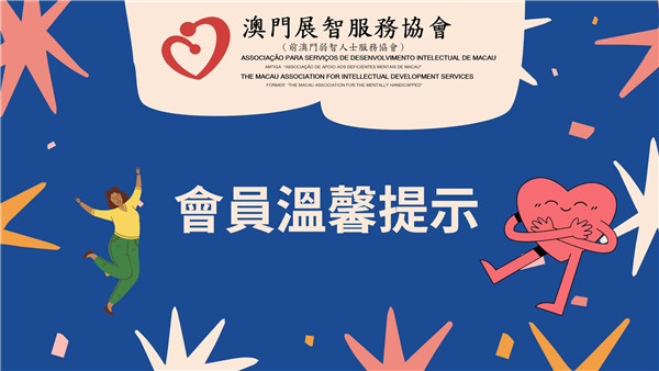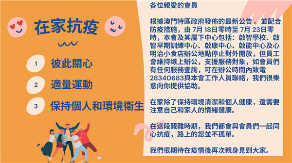 根據澳門特區政府發佈的最新公告 。並配合防疫措施,由 7月 18日零時至 7月 23日零時,本會及其屬下中心包括:啟智學校、啟智早期訓練中心、啟康中心、啟能中心及心明治小食店辦公地點停止對外開放,但員工會維持缐上辦公,支援服務對象,如會員們有任何服務查詢,可在辦公時間內致電28340683與本會工作人員聯絡,我們很樂意向你提供協助。