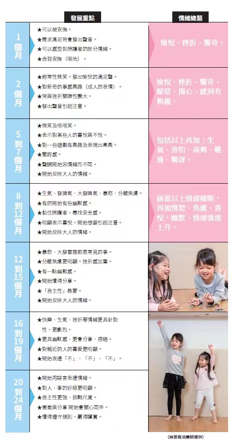 世博診所復健技術部主任林昱程職能治療師指出,如同嬰幼兒其他發展一樣,情緒發展也是循序漸進的,有所謂的情緒發展里程碑,每個階段發展的重點不同,而每一個孩子又有自身的發展節奏,建議每半年到一年觀察孩子的轉變,並與里程碑相比。