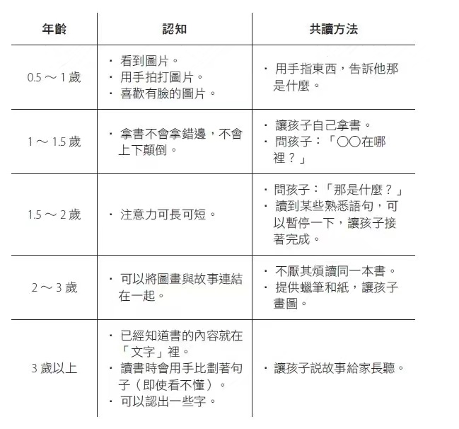 建議在開始親子共讀前,可以先去認識,不同年齡的兒童適合怎樣的書,對書本的反應是什麼(表19.1),擁有基本的了解之後,就不會再對親子共讀感到挫折了。