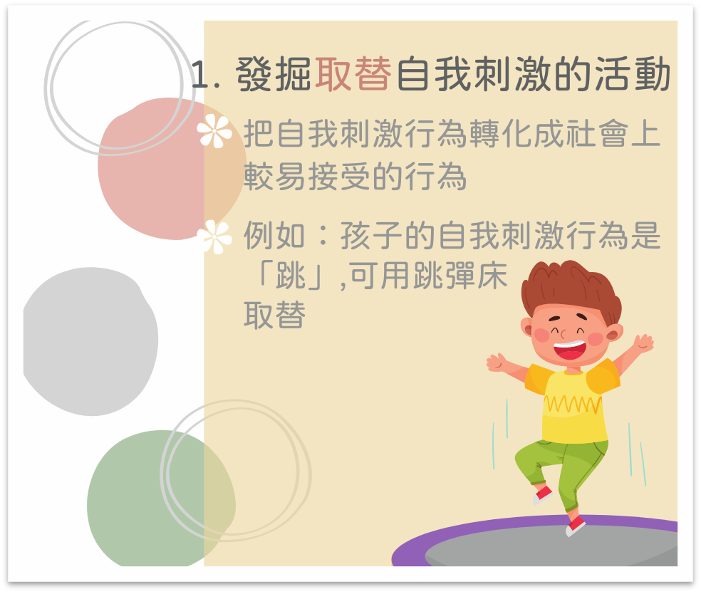 例如:孩子的自我刺激行是「跳」,可用跳彈床取替。