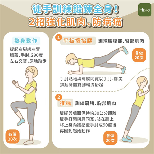 大家都知道運動能保持身體健康,但受新冠肺炎疫情影響,民眾們待在家的機率大增,部分肌力不足的民眾們更因為減少出門,活動力不足導致身體功能性的衰退。 而且在居家上班的人,更容易因為肌力不足、姿勢不良,造成身體疼痛。以下教兩招徒手訓練,在家也能夠幫助鍛鍊全身肌肉,而且也不需要太大的空間就能執行。
