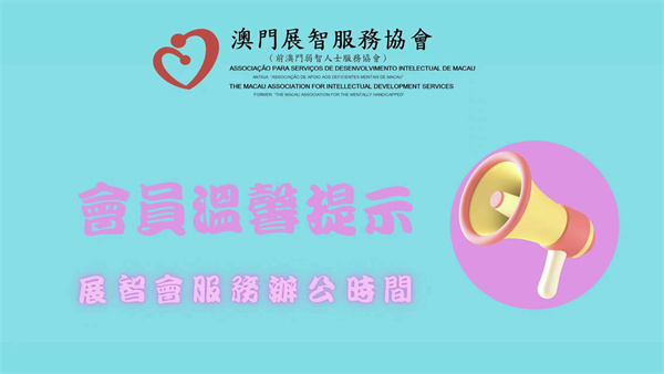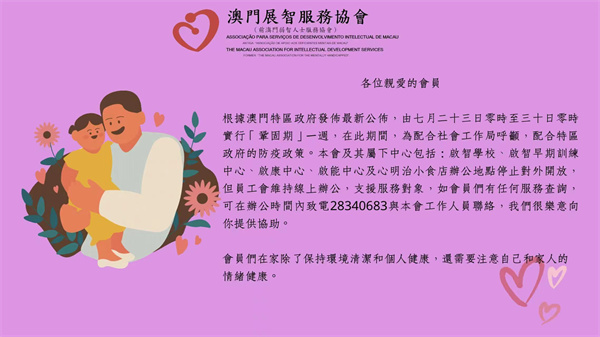 根據澳門特區政府發佈最新公佈,由七月二十三日零時至三十日零時實行「鞏固期」一週,在此期間,為配合社會工作局呼籲,配合特區政府的防疫政策。本會及其屬下中心包括:啟智學校、啟智早期訓練中心、啟康中心、啟能中心及心明治小食店辦公地點停止對外開放,但員工會維持缐上辦公,支援服務對象,如會員們有任何服務查詢,可在辦公時間內致電28340683與本會工作人員聯絡,我們很樂意向你提供協助。