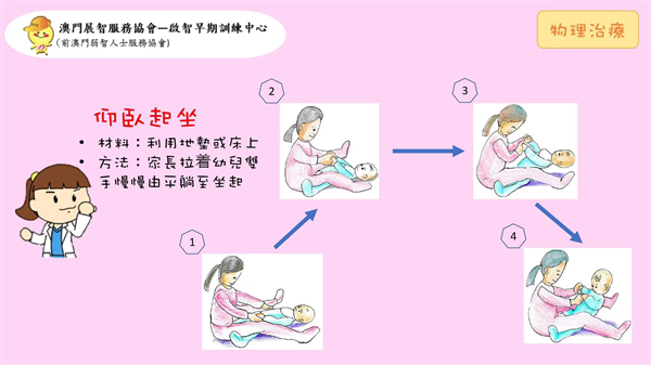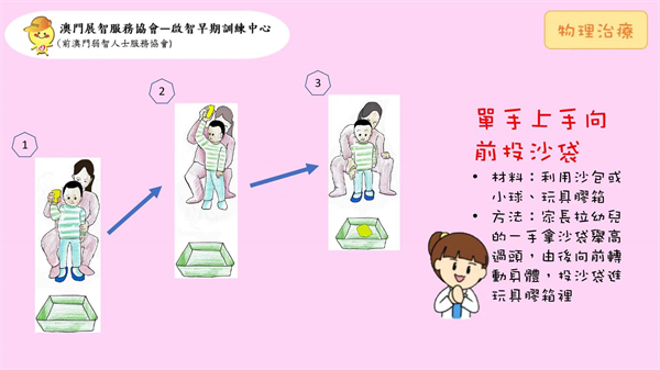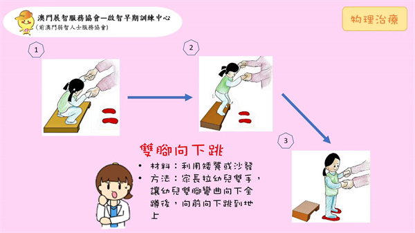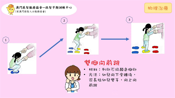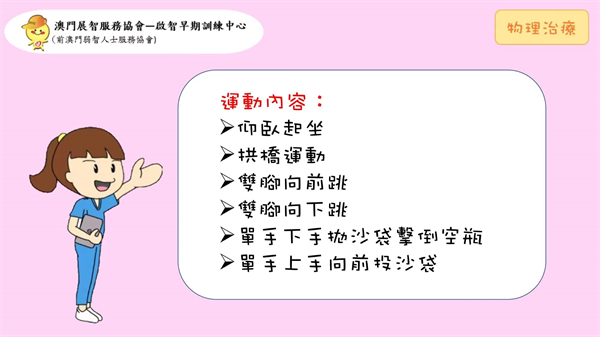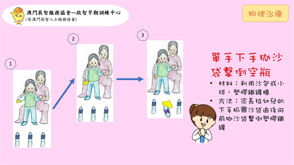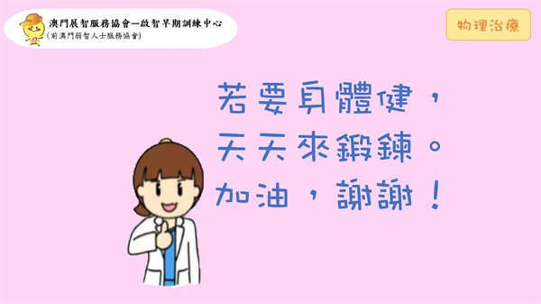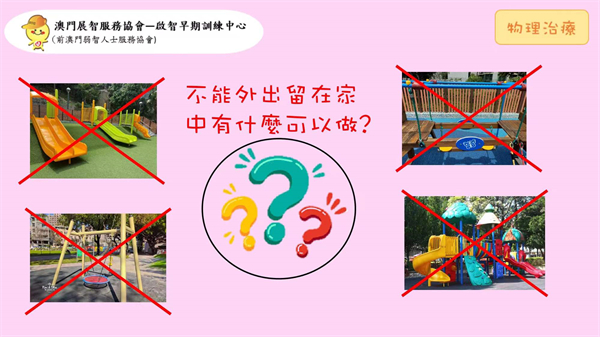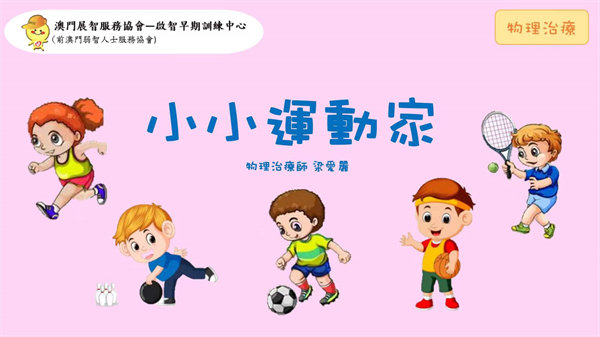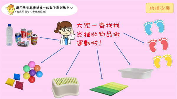 澳門展智服務協會屬下啟智早期訓練中心物理治療師 梁愛麗,為大家介紹疫情期間,小朋友不能外出,連公園也不能去,留在家中又可以做什麼運動呢?大家快來找找家中有什麼東西可以利用,搭配中心推出的教材套運動項目,一起來做小小運動家啦!