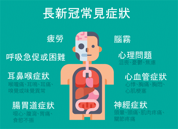 目前文獻中已記錄的後遺症就有200多種,又以疲勞、呼吸急促或困難、認知功能障礙(例如腦霧:包括無法集中注意力、無法專注思考、記憶變差、失眠等)最為常見。