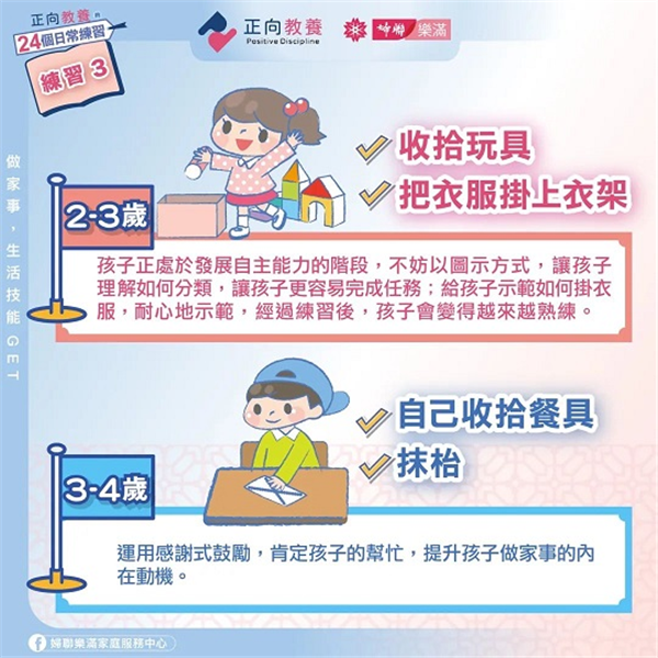 如 正向教養 提出,犯錯是學習的最佳機會,孩子在第一次嘗試做家事,肯定是有進步的空間。父母可以視乎孩子的年齡,給予孩子合乎能力範圍內的家事,把家事化成一個個小步驟讓孩子學習,陪伴孩子進行,培養孩子通過做家事獲得能力感。父母們更可以與孩子一齊透過訂定日常慣例表,讓做家事變得恆常化,提升孩子的自律。