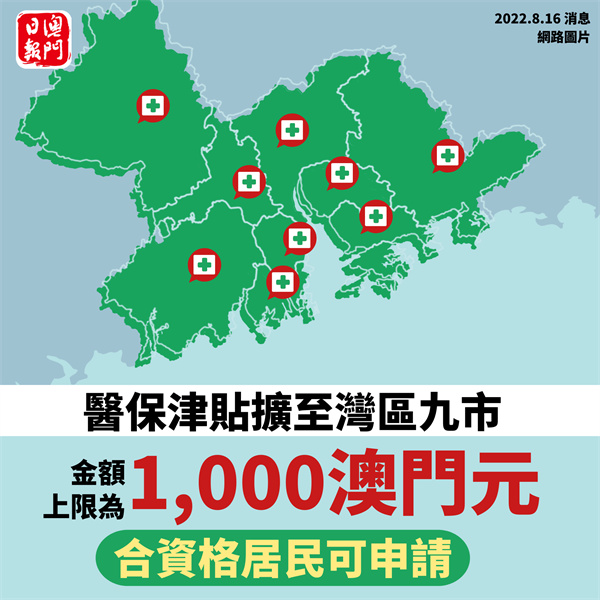 衛生局表示,根據第148/2022號行政長官批示,第16/2020號關於《居住於內地的澳門特別行政區居民醫療保險津貼計劃》行政法規所指的地區擴展至大灣區九市包括:珠海市、中山市、江門市、廣州市、深圳市、佛山市、惠州市、東莞市及肇慶市,以協助更多澳門居民加入內地基本醫療保險制度。