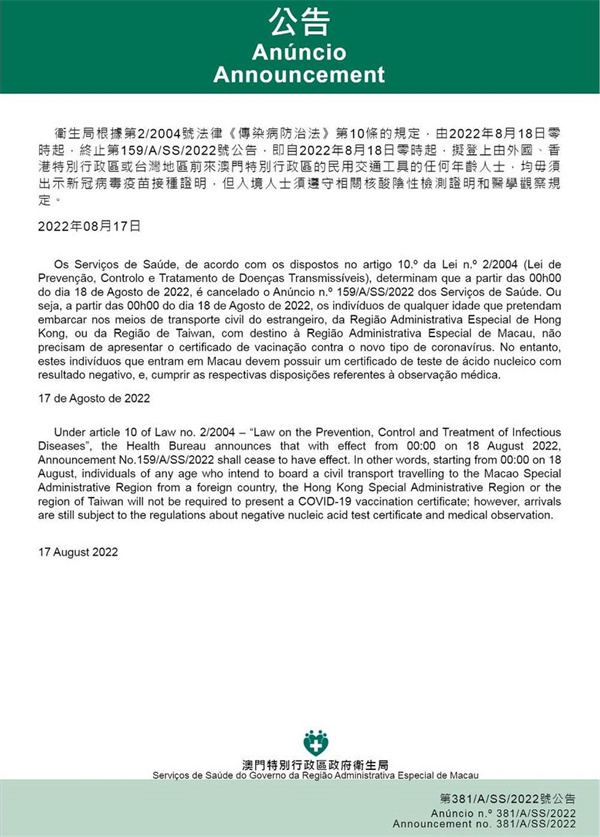 【澳門日報消息】新型冠狀病毒感染應變協調中心訊:應變協調中心表示,衛生局作出第381/A/SS/2022號公告,自今日零時起,終止第159/A/SS/2022號公告。即自今日零時起,擬登上由外國、香港特別行政區或台灣地區前來澳門特別行政區的民用交通工具的任何年齡人士,均無須出示新冠病毒疫苗接種證明,但入境人士須遵守相關核酸陰性檢測證明和醫學觀察規定。