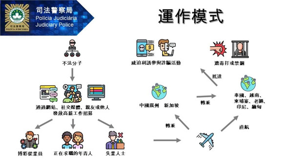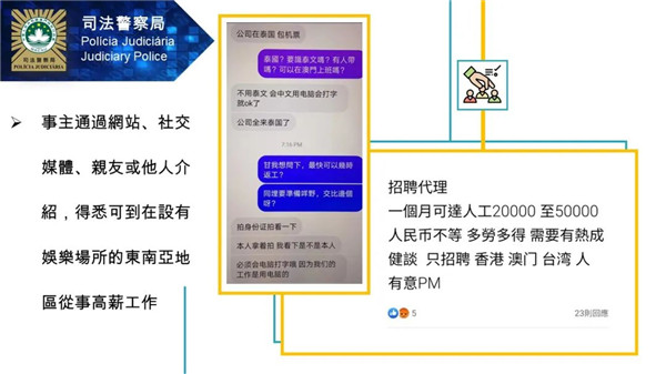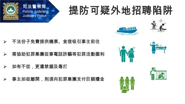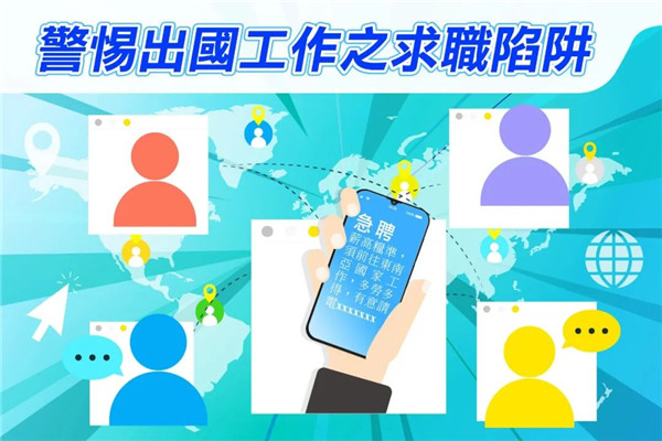 疫情下經濟受創,有不法之徒窺準求職者急於找工作的心理,透過社交媒體、手機即時通訊軟件或朋友介紹等方式,以高薪厚職作招徠,誘騙市民前往東南亞國家,如柬埔寨、老撾等地工作,實際上慫恿、強迫事主進行電話詐騙犯罪活動,過程中甚至有毆打或禁錮事主的情節。本局呼籲市民須提高防罪警覺,切勿輕信網絡上或陌生人聲稱的招聘訊息,以免因急於找工作而墮入求職陷阱。