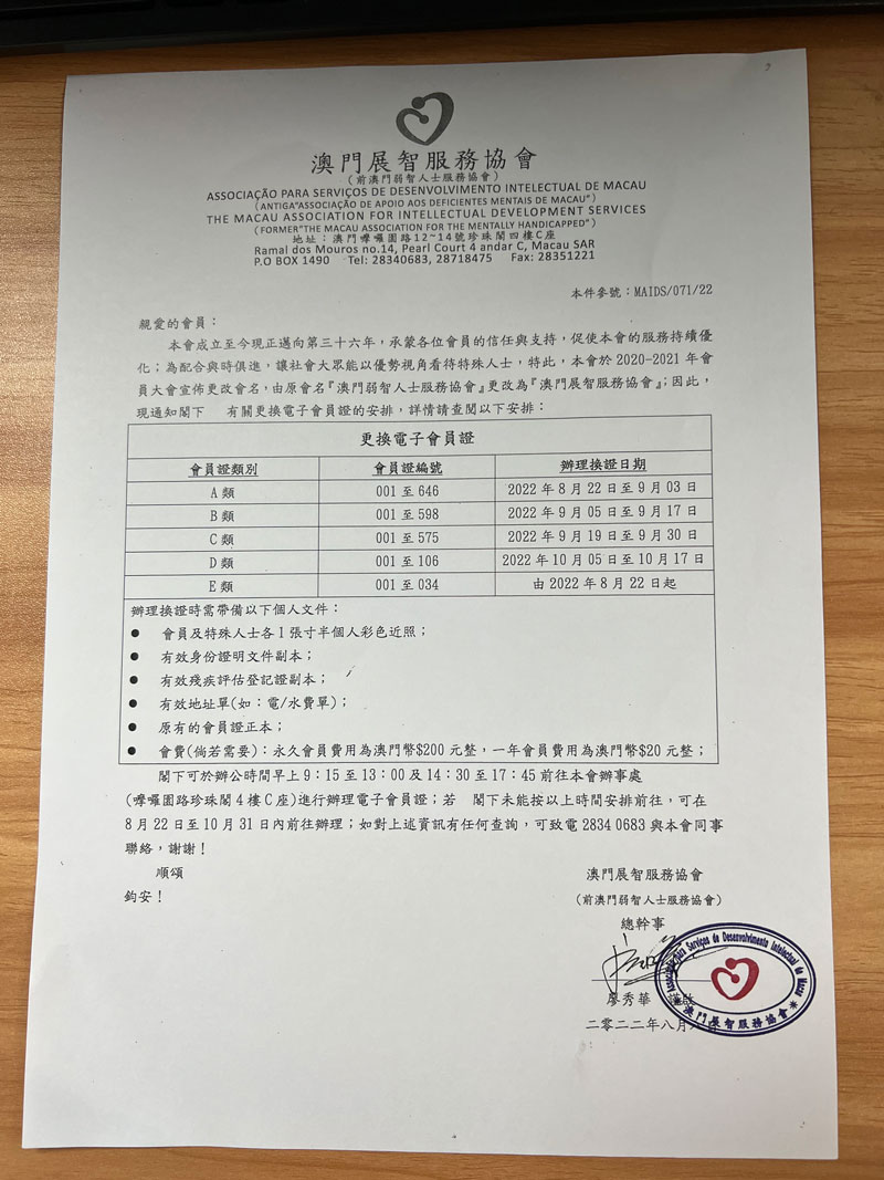 本會成立至今現正邁向第三十六年,承蒙各位會員的信任與支持,促使本會的服務持續優化,並於2020-2021年會員大會宣佈更改會名,由原會名『澳門弱智人士服務協會』更改為『澳門展智服務協會』;並於今日起正式開始更換會員證,有關更換電子會員證的安排,詳情請查閱以下安排: