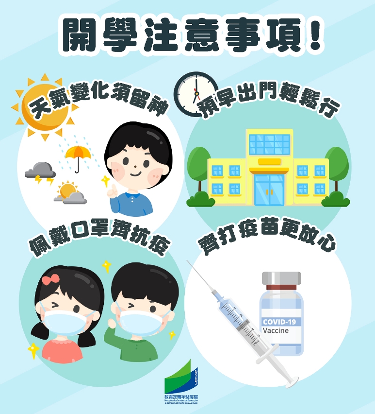 新學年即將到來,教青局呼籲家長和學生及早做好開學準備,密切留意特區政府公佈的最新交通、天氣和防疫資訊。