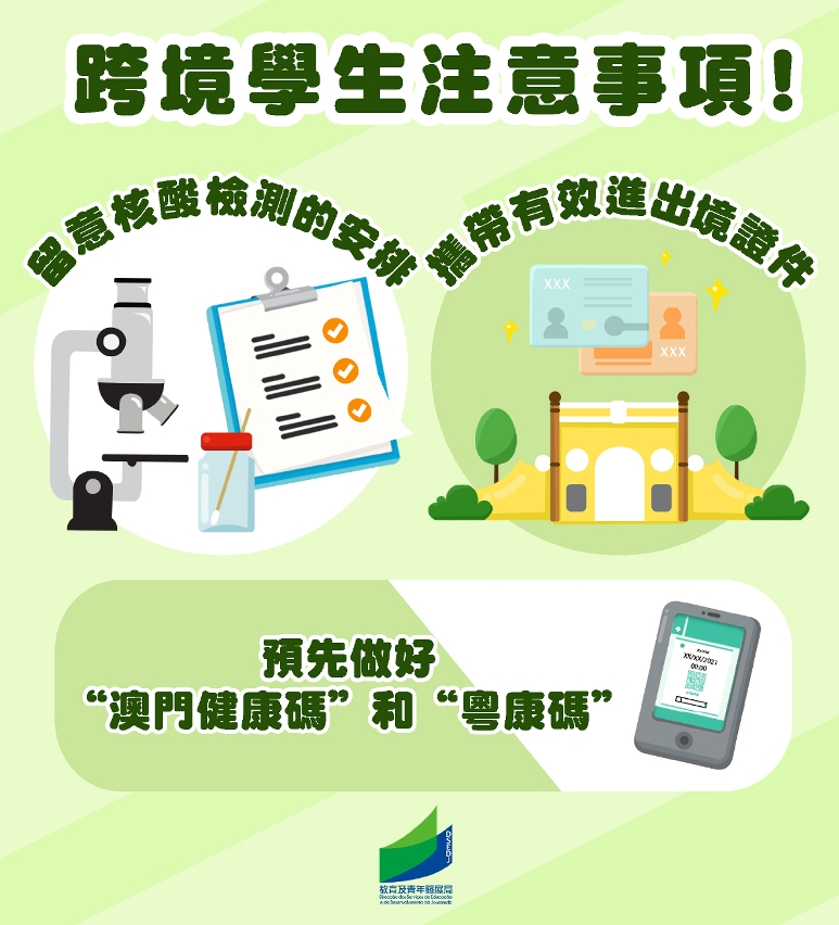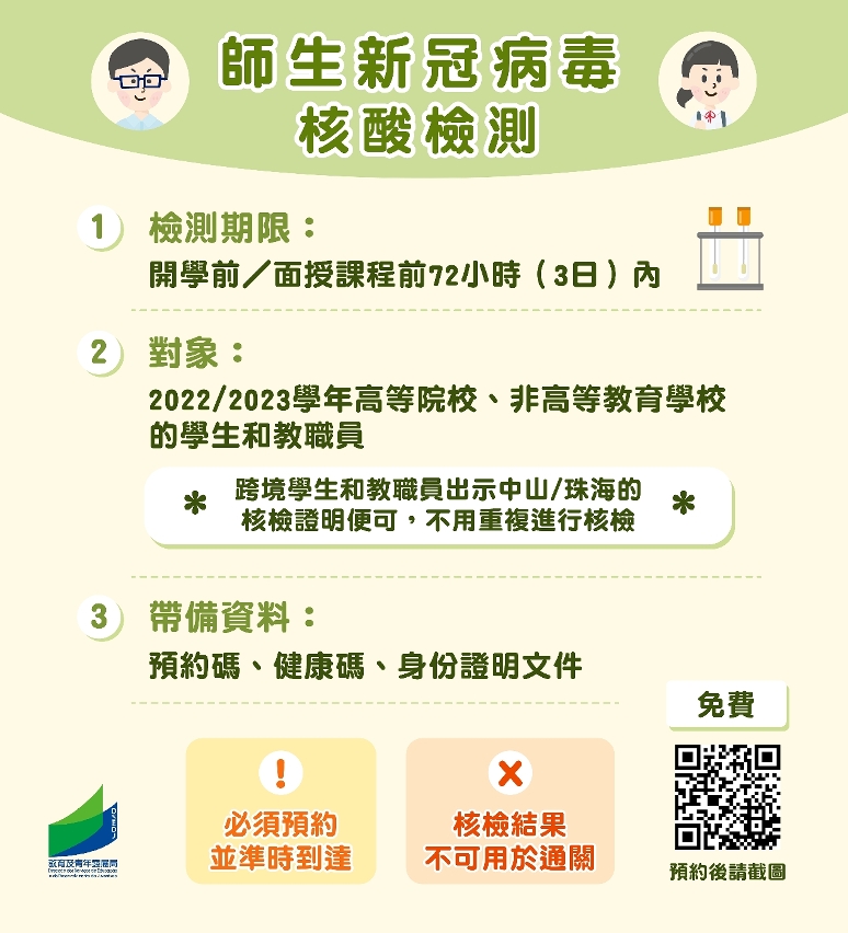 為確保師生的健康安全,教青局於8月上旬公佈高等院校和非高等教育學校的學生及教職員必須在開學日前10日返回常居地(澳門、珠海或中山),並須於開學當天持72小時(3日)內核酸採樣證明。為方便師生預約核酸檢測,已開通“師生新冠病毒核酸檢測預約系統”(https://app.ssm.gov.mo/studentrnabook),所有師生必須預約方可進行核酸檢測,切勿過早(超過30分鐘)或逾時到達,避免出現人群聚集;同時,檢測結果不可用於通關,亦不可作為重點工作人群的定期檢測使用;跨境學生和教職員只須在珠海或中山進行核酸檢測便可,無須特意回澳重複檢測。此外,高等院校和非高等教育學校的教職員和高等院校學生須向院校或學校出示已完成全程接種新型冠疫苗證明,或每週出示新冠病毒核酸檢測7天內結果為陰性的證明。