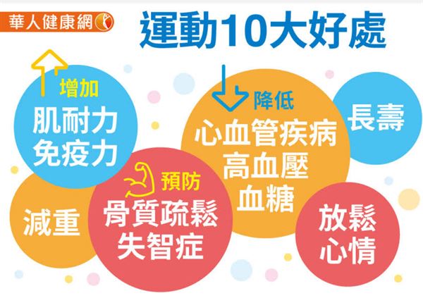 運動對身心各方面都有很大裨益,是保持身體健康不二法門。持續固定的中等強度運動最為有效,並能為身體帶來以下益處: