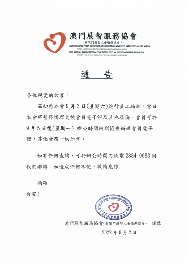 澳門展智服務協會(前弱智人士服務協會) 溫馨提示會員: