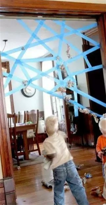 用膠帶將門貼成上圖這樣的蜘蛛網狀。把報紙揉成團,然後向蜘蛛網投擲,報紙團可以黏在膠帶做成的蜘蛛網上。規則可以自己制定,例如看黏上得多,或者看誰能把報紙團從空隙中投過去不被黏住等。