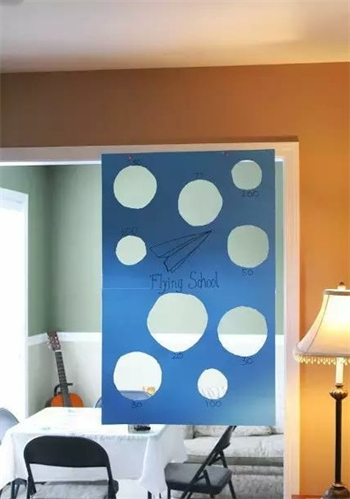 就是個室內紙飛機的遊戲,在屋內房門或者埡口的位置,在畫紙上挖出大小不同的洞,進洞越小得分越高。