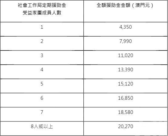 按照特區政府2022年財政年度施政報告,社會工作局將於9月5日起,透過全澳8家銀行以自動轉賬或沿用的派發方式,向2,326戶合資格的社會工作局定期援助金受益家團額外發放一個月全額援助金,預料總支出約1,460萬澳門元,以紓緩貧困家庭的生活壓力。