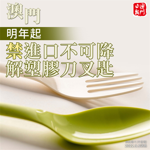 環保局訊:特區政府為保障本澳環境質素,按序推行減塑措施。繼推出一次性發泡膠餐具、不可降解一次性塑膠餐飲吸管及飲料攪拌棒的管制措施後,經綜合分析本澳實際情況及參考其他地區經驗,並與相關商會及業界進行交流和聽取意見後,特區政府根據經第3/2016號法律修改的第7/2003號法律《對外貿易法》第五條第一款(五)項之規定,透過第175/2022號行政長官批示,禁止不可降解一次性塑膠刀、叉、匙的進口,有關行政長官批示將於2023年1月1日起生效。