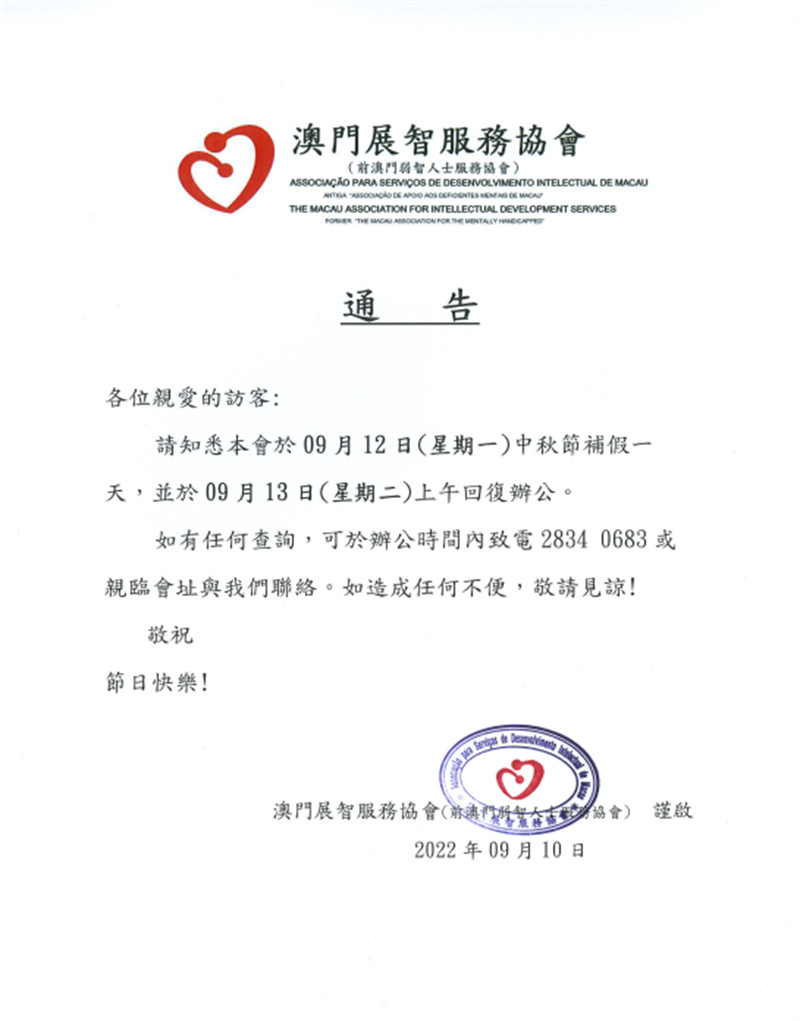 本會於9月12日(星期一)中秋節補假一天,當日本會將暫停辦理更換會員電子證及其他服務,會員可於9月13日後(星期二) 辦公時間內到協會辦理會員電子證,其他會務一切如常。如有任何查詢,可致電2834 0683與我們聯絡。如造成任何不便,敬請見諒