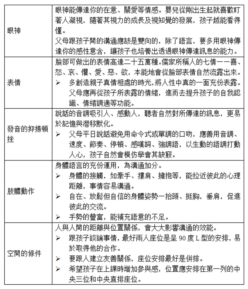 許多父母生了孩子後,就期待著哪一天他會開口叫爸媽。其實溝通的要素,除了語言本身外,還有非語言的部分。要達到溝通的目的,非語言的重要性遠遠勝過語言。因為溝通是為了傳達感受和意見,其中語言的影響力僅佔7%,音調的影響力佔38%,至於非語言的影響力卻佔了55%。