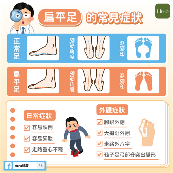 扁平足是指足部內側的足弓弧度減少站立時足弓呈下降或消失,形成鴨掌狀。平日我們站立、走路、跑步、跳躍時,足弓能協助維持身體平衡與支撐,並提供良好的缓衝避震能力,以減缓身體活動時,腳部所承受的各種壓力及來自地面的反作用力。足弓下塌改變了正常步行時的力學,因而影響小朋友走路的姿勢,常抱怨腳酸、腳疲勞、常跌倒等情況。隨著小朋友長大,體重和活動量增加,足弓的負荷越來越重,日後可能衍生不同慢性的足部問題及其他骨骼、關節毛病,如足弓腳、拇指外翻、腳痛丶膝痛等。