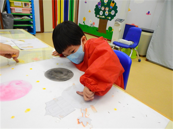 幼兒們合作的粉彩畫作在老師協助下終於完成了。