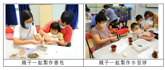 首先活動由導師使用投影片向參加者們簡單地介紹了園藝治療的來源及功能,並就活動的每個步驟一邊示範一邊講解,並按照幼兒的年齡和精細動作能力下,設計了專屬香包製作活動。讓幼兒們透過採擷、捽和搣的動作,把原本已風乾了的香料:薄荷葉、玫瑰花、薰衣草、香茅和陳皮整碎,再用小手或用匙羹將整碎了的香料裝入袋子裏,此番操作除了讓幼兒的前三指和手眼協調得到練習之外,也讓幼兒的視覺、嗅覺、聽覺和觸覺感觀得到刺激和學習。家長們對於能夠和幼兒一起按照個人的喜好,把不同的香料的組合成獨一無二的天然香包感到新奇又喜愛。