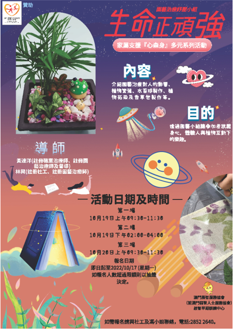 啟智早期訓練中心除了注重幼兒全人發展、治療干預外,深知家長日常在照顧有特殊需要幼兒的壓力擔子百石千斤,因此中心在社會工作局的部分資助下,將會舉行家屬支援『心森身』多元系列活動二-「生命正頑強」園藝治療紓壓小組,期望透過園藝小組讓參加者放鬆身心,體驗人與植物互動下的樂趣,以另一種方式親近大自然,活動詳情如下: