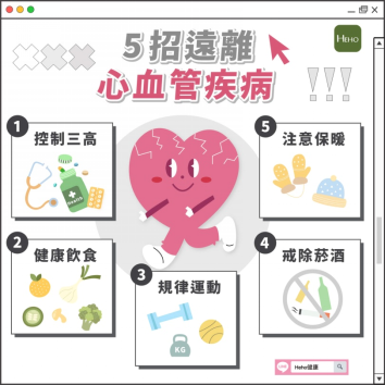 5 招遠離心血管疾病 1. 控制三高 年齡越大,罹患三高的風險就越高,近年來甚至有年輕化的趨勢,而三高患者應定期測量血壓、血糖,並遵照醫師指示用藥及定期回診追蹤,嚴格做好三高的控管。 2. 健康飲食及體態控制 均衡飲食對健康來說尤其重要,應多吃蔬果及適量的肉、魚、蛋和奶類,並減少鹽、油、糖分的攝取,而身體質量指數 (BMI) 也應控制在 18.5〜24 之間,腰圍部分,成年男性控制小於 90 公分、女性小於 80 公分。 3. 規律運動 運動前需充分暖身,達到減緩壓力、放鬆情緒的狀態,並於適宜的溫度下外出運動,若要泡湯,溫度應低於 40 度且避免冷熱湯交替,會導致血管急速舒張、收縮,易引發心肌梗塞,因此須特別留意水溫。 4. 戒除菸酒 吸煙者罹患心血管疾病的風險會升高 2~7 倍,而長期吸入二手菸的人,也會有中風或心臟病發的機率。另外,飲酒會使血管脈動的更劇烈,為心臟病發作或中風的主要危險因素,因此,應遠離煙酒才能保有健康的身體。 5. 注意保暖 應時刻留意天氣變化,善用圍巾、帽子、口罩、手套、襪子,及多層次保暖衣物等,適時增減衣物,達到保暖效果。