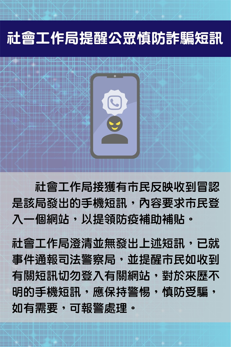社會工作局接獲有市民反映收到冒認是該局發出的手機短訊,內容要求市民登入一個網站,以提領防疫補助補貼。