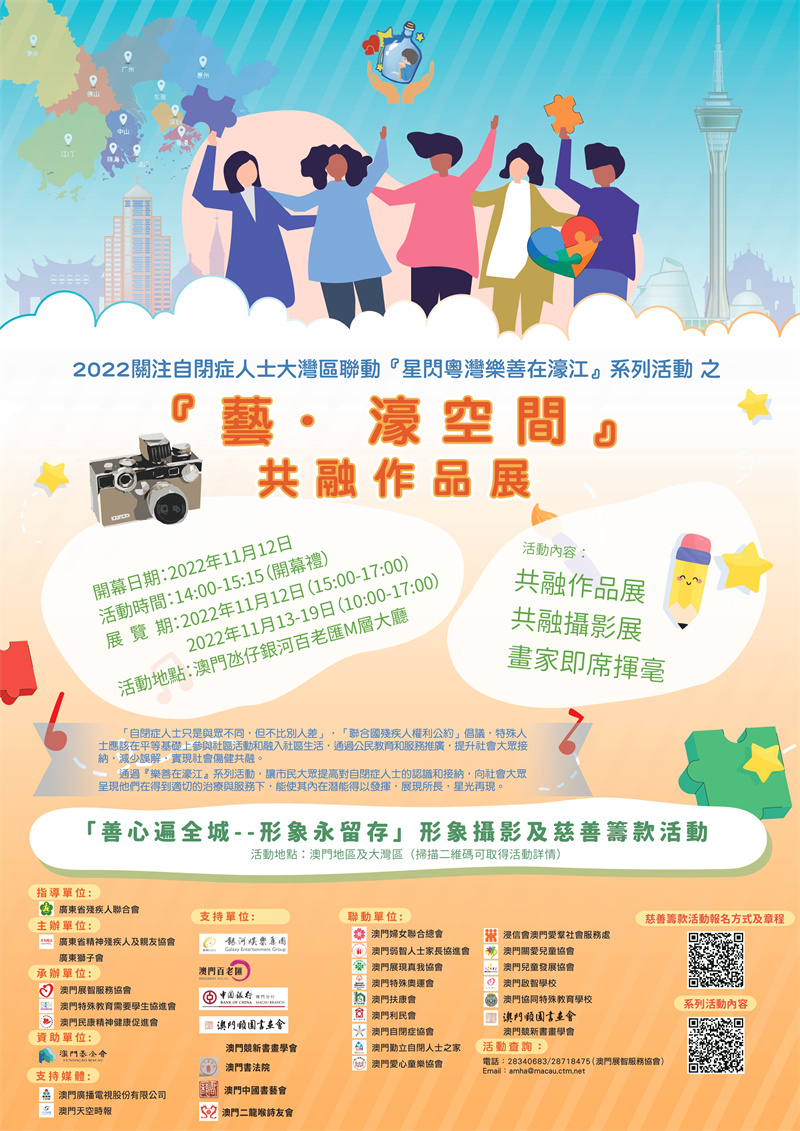 本會現謹訂於11月12日(星期六)14:00至15:30假「澳門百老匯」M層舉辦名為『星閃粵灣樂善在濠江』之『藝・濠空間』共融作品展活動,是次展覽為期6日,屆時共展出33幅畫作作品及9件立體作品以及15幅親子共融拍攝照,以下表格為活動當日的簡易流程: