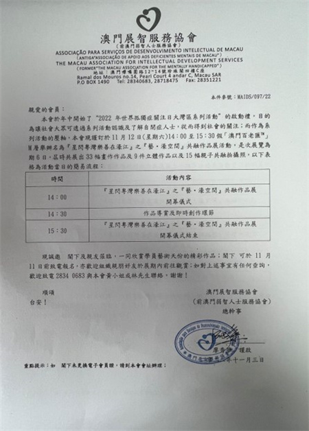 本會現謹訂於11月12日(星期六)14:00至15:30假「澳門百老匯」M層舉辦名為『星閃粵灣樂善在濠江』之『藝・濠空間』共融作品展活動,是次展覽為期6日,屆時共展出33幅畫作作品及9件立體作品以及15幅親子共融拍攝照,以下表格為活動當日的簡易流程: